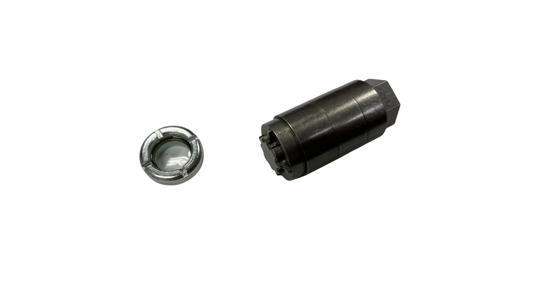 This tool is used to install the Large Sight Glass in the newly designed TBS Front Covers. This tool is manufactured with 4 tabs and a center register to locate into the center if the Sight Glass for ease of installation. The opposite end is machined with a 3/4″ hex for use with wrench or socket. This tool also works on Holley Supercharger and Carburetor Sight Glasses as well.