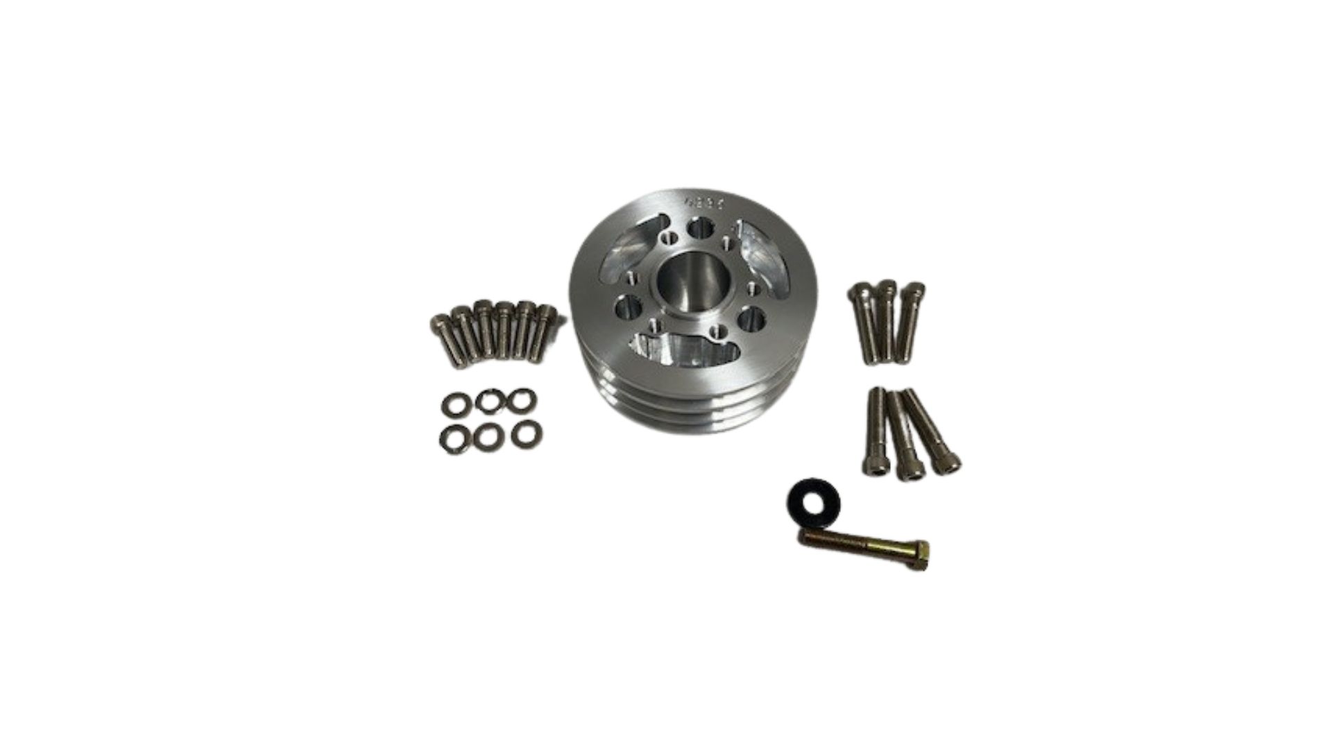 This 3v accessory pulley is for a SBC with the use of a long water pump. This pulley is machined from 6061-T6 Alum and is 2.875″ wide. It is designed for use with a standard 3 bolt Chevy balancer and comes standard with 2.0″ register for the blower pulley. Pulley includes mounting hardware as shown.
